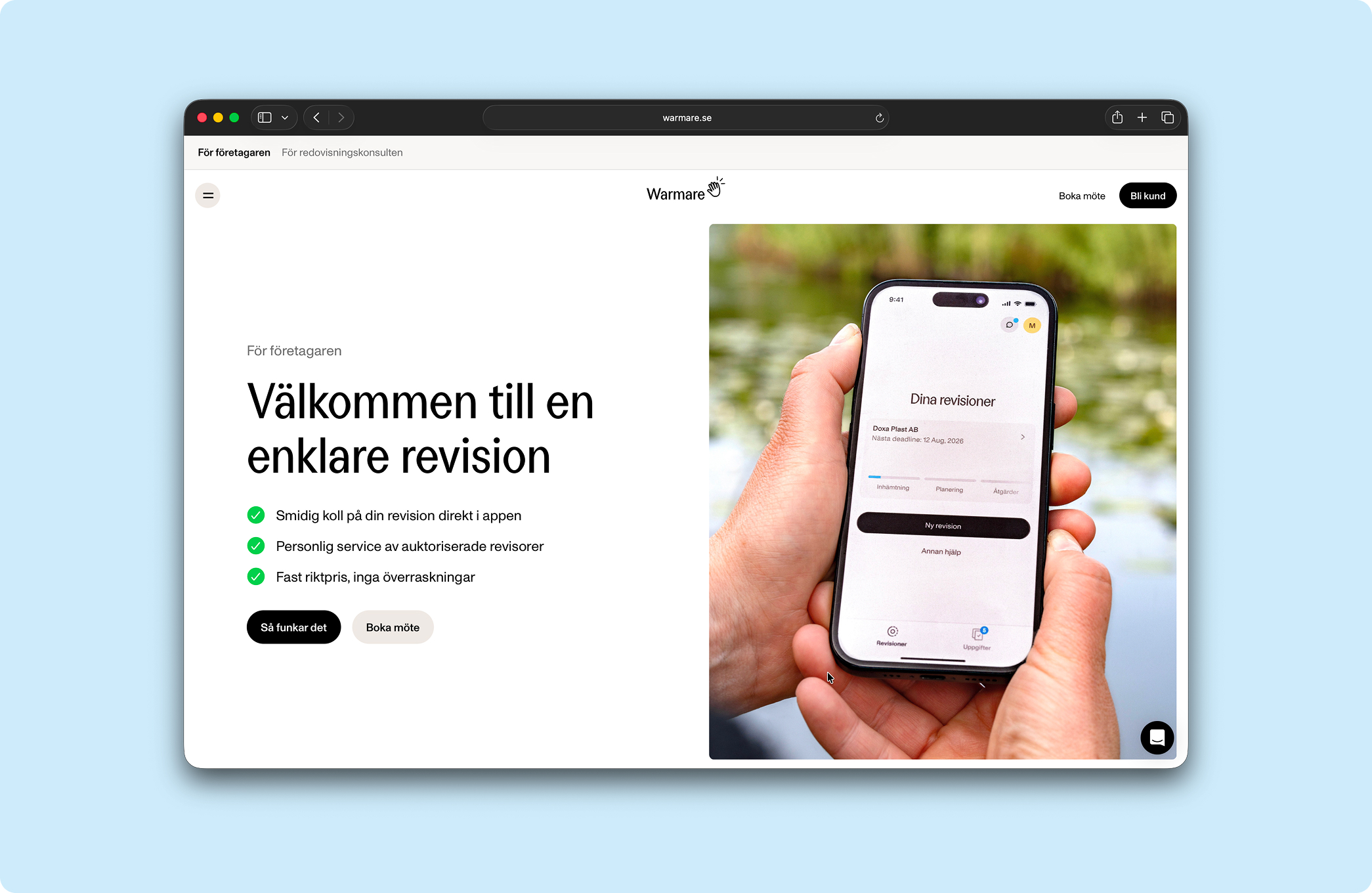 Att det här är revision på riktigt. Att man får möta folk som bryr sig. Att tekniken är modern, och känslan är mänsklig. Att du förstår hur vi jobbar, inte behöver gissa. Och att du alltid vet att vi gör det tillsammans. För det är ju Warmare i ett nötskal: